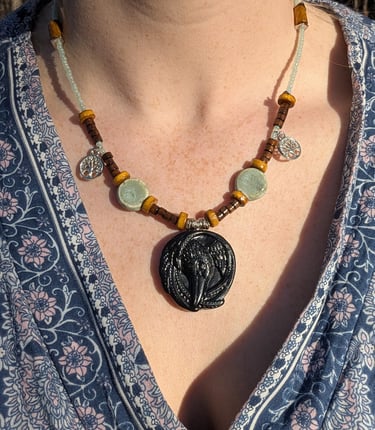 My journals and jewelry are lovingly made with upcycled materials and treasures found in the woods. Collecting each acorn, pine cone, and hickory nut is sacred to me, as I believe that divine intelligence is shown through nature's beauty, patterns, and symmetry. Working with natural materials gives a sense of collaborating with God to create something beautiful. My hope is that everyone who wears my jewelry or does work in my journals feels a deeper connection to nature.